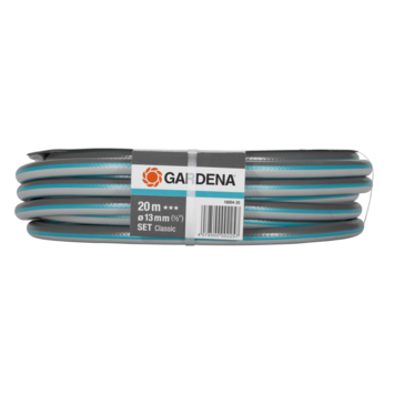 Le set de tuyau d'arrosage classique Gardena 20 mètres est un système original Gardena qui est livré prêt à l'emploi avec toutes les pièces nécessaires. Avec le tuyau d'arrosage, vous trouverez un robinet, un adaptateur, un tuyau, un arrêt d'eau et un pommeau d'arrosage de jardin. L'arrosage peut commencer !