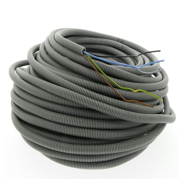 Le tube annelé flexible précâblé gris d'un diamètre de 16 mm contient 5 fils VOB de 1,5 mm² et peut être utilisé à des fins industriels et ménagers. Le tuyau a une longueur de 50 mètres.