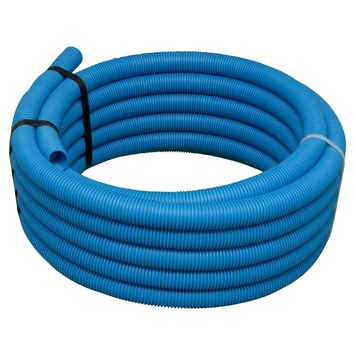 Le tuyau VPE-c est en fait un 'tuyau dans un tuyau' : une conduite pour eau froide, protégée par une enveloppe. Ce tuyau permet le transport d'eau sanitaire (eau potable, eau de pluie, pour radiateur, chauffage par le sol) et est disponible en différentes longueurs et diamètres. Celui-ci, de couleur bleue, mesure 10 m de long et 20 mm de diamètre.