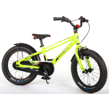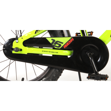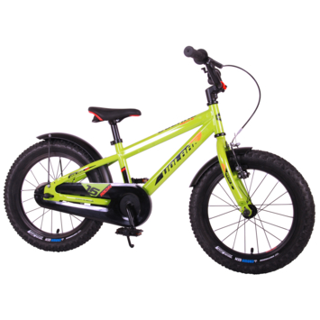 La gamme de vélos pour enfants Volare Rocky est de qualité supérieure. Le vélo Rocky a des jantes en aluminium, une potence en aluminium, des pédales de meilleure qualité, des rayons noirs et une luxueuse selle super douce avec prise pour les parents. Le Rocky 16 pouces est un vélo pour garçon cool avec des pneus extra larges qui feront battre le cœur de chaque enfant plus vite. Les garde-boue sont également extra larges et joliment formés, de sorte qu'ils arrêtent toutes les éclaboussures de saleté. Pour ralentir, le vélo dispose d'un système de freinage sûr avec un frein en V en aluminium robuste. Le tube de selle est extra bas avec une tige de selle extra longue, de sorte que le vélo puisse grandir avec votre enfant. De plus, le vélo dispose d'un système de contrôle intelligent en aluminium, qui garantit que le guidon est limité (non réglable en hauteur). Les poignées sont en Kraton, un caoutchouc souple, ce qui rend les poignées confortables à tenir. Le vélo a un garde-chaîne fermé, un support solide (pas de roues d'entraînement !!) et une sonnette de vélo. Le cadre géométrique de couleur vert vif avec des autocollants de transfert d'eau fait de ce vélo un véritable accroche-regard. Ce vélo est le vélo pour inspirer les enfants à découvrir le monde. De plus, le vélo est assemblé à 95 %, donc presque prêt pour le cyclisme. Si facile!