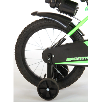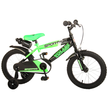 Vélo pour enfants Volare Sportivo 16 pouces. Le cadre en acier solide a un look très sportif avec le vert fluo cool avec des couleurs noires. Avec la bouteille dans le porte-bouteille pratique, votre enfant a toujours quelque chose à boire avec lui. Les garde-boue arrêtent toutes les éclaboussures de saleté. Pour ralentir, le vélo dispose à la fois d'un frein à main et d'un rétropédalage. Le garde-chaîne est fermé pour protéger les petits doigts. Pour apprendre à faire du vélo rapidement, le vélo est équipé de roues d'entraînement amovibles. Les pneus pneumatiques de 16 pouces rendent le vélo adapté aux enfants cool entre 4 et 6 ans avec des vêtements de taille 104-110. De plus, le vélo est assemblé à 95 %, donc presque prêt pour le cyclisme. Si facile!