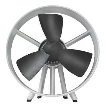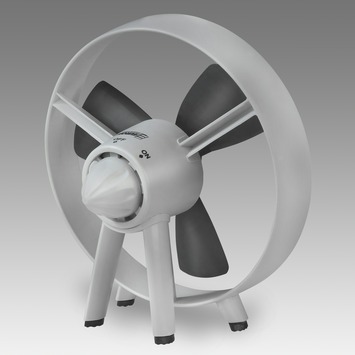 Le ventilateur de table Safe Blade d’Eurom ressemble à s’y méprendre à un moteur d’avion, non ? Il est fabriqué en plastique blanc, convient pour être posé sur le sol et dispose d’un câble de 1,75 m de long.