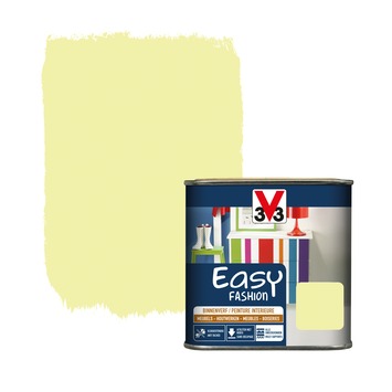 La peinture pour l'intérieur Easy Fashion de V33 est votre alliée idéale pour la décoration ou la rénovation de surfaces en bois, comme vos chambranles, meubles, cadres, etc. Ce vernis satiné de couleur citronelle (500 ml) adhère aux surfaces traitées ou non traitées. Cerise sur le gâteau : Easy Fashion est facile à appliquer, ce qui vous évite le décapage et le ponçage. Cette peinture résiste même à l'eau, aux taches, aux rayures, et aux chocs. Disponible en d'autres couleurs.