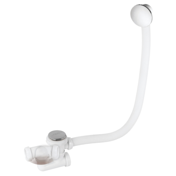 Ce système d'évacuation pour baignoire dispose d'une bonde click-clack super pratique. Le siphon d'un diamètre de 40 mm se visse et dévisse par le dessus et a une sortie rotative. Le bouchon de 50 mm est en inox chromé, il est amovible pour faciliter l'entretien. Le tube trop-plein mesure 70 cm et est surmonté d'une rosace blanche.