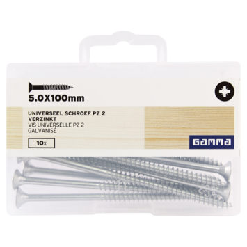 Ces vis à tête plate de GAMMA sont en acier galvanisé et peuvent être utilisées de manière universelle. Ils ont une tête fraisée PZ 2 et un entraînement pozi. Vous pouvez donc utiliser ces vis standard avec un tournevis cruciforme. La vis a un filetage partiel et convient au vissage serré de deux couches de bois. La vis à filetage partiel a un revêtement de cire pour un meilleur traitement. Les vis ont une longueur de 100 mm et un diamètre de 5 mm. Ils peuvent être utilisés aussi bien à l'intérieur qu'à l'extérieur en aggloméré et en bois. Un paquet contient 10 pièces.