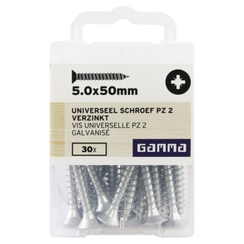 Ces vis à tête plate de GAMMA sont en acier galvanisé et peuvent être utilisées de manière universelle. Ils ont une tête fraisée PZ 2 et un entraînement pozi. Vous pouvez donc utiliser ces vis standard avec un tournevis cruciforme. La vis a un filetage sur toute la longueur, et offre donc beaucoup d'adhérence dans le matériau. La vis à filetage complet est pourvue d'un revêtement de cire pour un meilleur traitement. Les vis ont une longueur de 50 mm et un diamètre de 5 mm. Ils peuvent être utilisés aussi bien à l'intérieur qu'à l'extérieur en aggloméré et en bois. Un paquet contient 30 pièces.