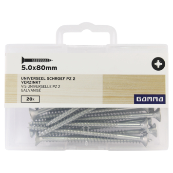 Ces vis à tête plate de GAMMA sont en acier galvanisé et peuvent être utilisées de manière universelle. Ils ont une tête fraisée PZ 2 et un entraînement pozi. Vous pouvez donc utiliser ces vis standard avec un tournevis cruciforme. La vis a un filetage partiel et convient au vissage serré de deux couches de bois. La vis à filetage partiel a un revêtement de cire pour un meilleur traitement. Les vis ont une longueur de 80 mm et un diamètre de 5 mm. Ils peuvent être utilisés aussi bien à l'intérieur qu'à l'extérieur en aggloméré et en bois. Un paquet contient 20 pièces.