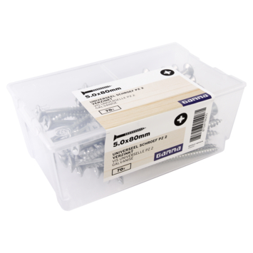Ces vis à tête plate de GAMMA sont en acier galvanisé et peuvent être utilisées de manière universelle. Ils ont une tête fraisée PZ 2 et un entraînement pozi. Vous pouvez donc utiliser ces vis standard avec un tournevis cruciforme. La vis a un filetage partiel et convient au vissage serré de deux couches de bois. La vis à filetage partiel a un revêtement de cire pour un meilleur traitement. Les vis ont une longueur de 80 mm et un diamètre de 5 mm. Ils peuvent être utilisés aussi bien à l'intérieur qu'à l'extérieur en aggloméré et en bois. Un paquet contient 70 pièces.