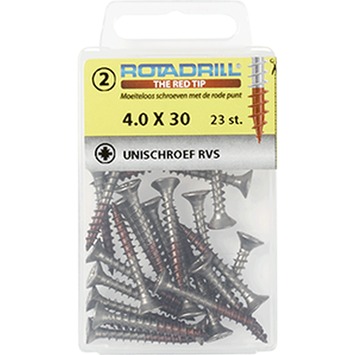 Vous cherchez une vis universelle à utiliser à l’intérieur comme à l’extérieur, dans une cheville ou dans le bois ? Optez pour la vis universelle Rotadrill en inox à tête plate Pozidrive 4,0x30 mm (23 pces). Également appelée vis pour aggloméré, cette vis universelle Rotadrill est le modèle le plus utilisé pour le bois, mais aussi pour les panneaux, tels que les panneaux de fibres ou en aggloméré. Cette vis possède une tête plate conique, qui peut être discrètement noyée dans le bois. Son empreinte cruciforme est de type PZ2. Elle se visse donc avec un embout ou tournevis à fente en croix de taille moyenne. Fabriquée en acier inoxydable, elle ne craint pas la rouille. La couleur rouge de la pointe des vis Rotadrill est due à la présence d’un lubrifiant breveté, qui facilite l’entame et le vissage dans divers matériaux de construction. Ce produit est vendu par 23 pièces. À la recherche d’une autre dimension ? Pas de problème : GAMMA vous propose un vaste assortiment de différents matériaux, tailles et empreintes. Bref, cette vis universelle Rotadrill facilite la vie de tous les bricoleurs.