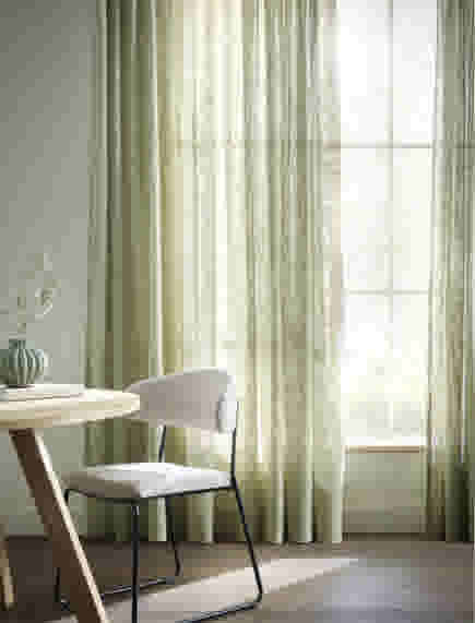 En plaçant plusieurs couches de rideaux, vous pouvez jouer avec la luminosité selon vos besoins. Pour habiller les fenêtres du salon pensez par exemple à combiner des rideaux transparents et des rideaux verts plus épais.