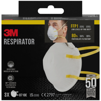 Het 3M™ Stofmasker voor handmatig schuren 8710E is ons gelaatsmasker met filter met een robuuste vormvaste schaal, een verstelbare neusbeugel en kleurgecodeerde hoofdbanden voor comfortabele bescherming. Het is FFP1-geclassificeerd en verkrijgbaar in een verpakking van 3 stuks.