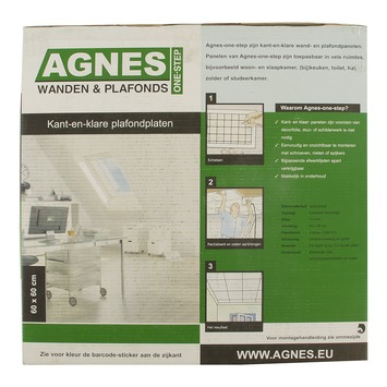 Met de Agnes plafondplaat stuc wit 60x60 cm 5 stuks geniet je binnen 1 dag van jouw nieuwe plafond. De schroeven zijn niet zichtbaar dankzij het speciale tong- en groefsysteem van Agnes One-Step. Hierdoor ben je geen tijd meer kwijt aan het opvullen van gaten, afstrijken, schuren etc. De Agnes plafondplaat is te monteren op een houten rachelwerk, de aanbevolen dikte van het hout is 32mm dik en breedte 48mm. De Agnes plafondplaat is compact en licht van gewicht: De plaat weegt minder dan een gipsplaat. Wel zo fijn bij klussen boven jouw hoofd. De Agnes plafondplaat stuc wit 60x60 cm 5 stuks is geschikt voor gebruik in huis in (droge) ruimtes die voldoende goed geventileerd worden. De toplaag is kant en klaar voor gebruik en het achteraf schilderen van de platen is dan ook niet nodig. Het paneel bestaat uit spaanplaat met een decoratieve decorfolie. De decorfolie is geheel uit 1 stuk om het spaanplaat verlijmd waardoor er geen naden te zien zijn bij de overgang van het oppervlak naar de zijkant. De Agnes plafondplaat is per 5 stuks verpakt in een kartonnendoos. De inhoud van 1 pak is +/- 1,8 m2. (Tip: Houd bij de berekening van de oppervlakte van het plafond wel rekening met enig zaagverlies). In het plafond kan je relatief eenvoudig inbouwspotjes plaatsen. Kies binnen Agnes lijstwerk jouw profielen voor de detailafwerking van het nieuwe plafond. Het spaanplaat van de platen is PEFC gecertificeerd en daarmee afkomstig uit duurzaam beheerde bossen. De Agnes One - Step platen en profielen zijn eenvoudig schoon te houden met een vochtige doek en een niet agressief schoonmaakmiddel.