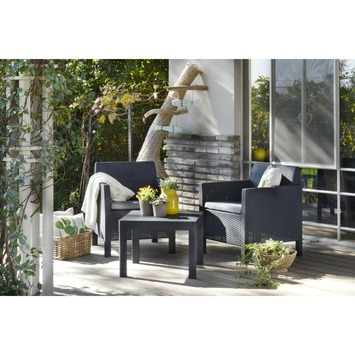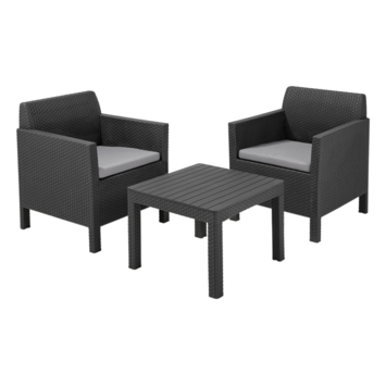 De balkonset Orlando Balcony van Allibert is gemaakt uit kunststof in de kleur antracietgrijs en heeft een gevlochten wickerlook. De set bestaat uit 2 stoelen met comfortabele arm- en rugleuningen, evenals 1 lage vierkante tafel. De compacte set wordt geleverd inclusief grijze zitkussens. Goed om te weten: deze set past perfect op een klein terras of een balkon. De tuinmeubelen uit kunststof zijn daarenboven onderhoudsvrij, weerbestendig en stevig. Wat wil je nog meer? Tip: voor meer zitplaats(en) kan je voor de loungeset Orlando kiezen. Die set biedt plaats aan 4 personen.