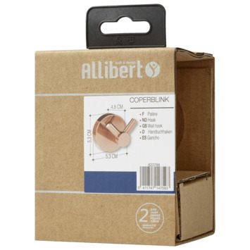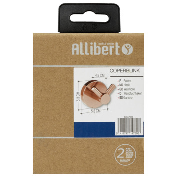 De Allibert dubbele haak Coperblink Koper is een stijlvolle haak die in elk interieur goed tot zijn recht komt. De dubbele haak is gemaakt van inox, wat betekent dat je deze bij uitstek kunt gebruiken in vochtige ruimtes zoals de badkamer of het toilet. Je monteert het met de meegeleverde schroeven en pluggen eenvoudig zelf aan de wand. Met de koperen afwerking geeft de haak een luxe uitstraling aan je badkamer of toilet, maar ook aan andere ruimtes in je huis! Heb je toch liever een andere kleur? Je kunt ook kiezen voor goud, chroom of inox.