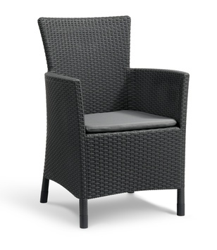 Lekker genieten in je tuin met de stoel Montana. De stoel is gemaakt van grafiet kunststof met wickerlook. Dit materiaal is weerbestendig en onderhoudsvriendelijk. Je kan de stoel dus zonder problemen buiten laten staan. Een grijs zitkussen is inbegrepen en biedt je goed zitcomfort. De stoel Montana is dus een gemakkelijke tuinstoel om optimaal van jouw tuin of terras te genieten.