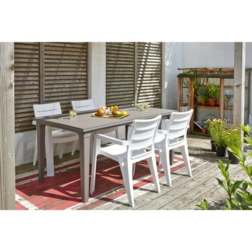 De Futura tafel van Allibert is een tuintafel voor ’t leven. Hij is gemaakt uit stevige, kunststof in de kleur cappuccino. De tuintafel doorstaat weer en wind én is bovendien makkelijk te onderhouden. Het tafelblad is gelijnd, 4 cm dik en beschikt over een opening voor een parasol. Dankzij het universele design kan je de tuintafel zowel met klassieke als moderne tuinstoelen combineren. Ideaal voor 6 personen. Ook verkrijgbaar in de kleur grafiet. Mooi meegenomen: je kan de poten losdraaien, zodat je de tafel makkelijk kan opbergen in je tuinhuis (bijvoorbeeld tijdens de winter).