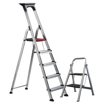Deze set bestaat uit een Altrex 5-treeds Double Decker huishoudtrap met een 2-treeds Giant huishoudtrap. De Altrex Double Decker 5 treeds huishoudtrap is lichtgewicht, veilig en stabiel met veel extra's. De SmartBox is handig om materiaal in of op te leggen. Met de HandGrip is het border gemakkelijk te borgen en te ontgrendelen. De dubbele trede biedt twee comfortabele werkplekken. Met grote slijtvaste voeten voor extra stabiliteit. De Giant 2-treeds huishoudtrap is een praktische en makkelijk op te bergen huishoudtrap die makkelijk te gebruiken is in bijvoorbeeld de woonkamer of keuken. Om snel even bij een hoge kast of om bij de gordijnen te kunnen komen. De treden zijn voor zijn van anti-slip materiaal en de trap is opklapbaar waardoor deze makkelijk op te bergen is.