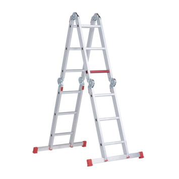 De vouwladder van Altrex is maximaal 4,3 meter hoog en 3,4 meter breed, beschikt over één plank om op te staan en noppen uit rode kunststof voor (nog) meer standvastigheid tijdens het klussen.