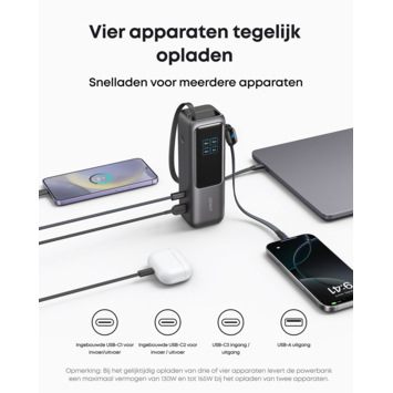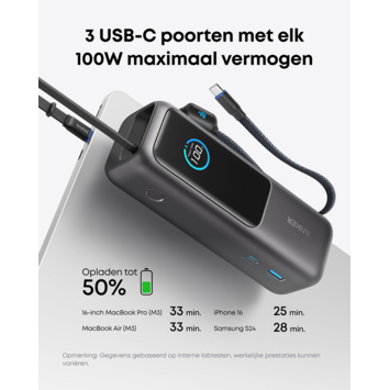 De Anker powerbank snelladen 25.000 mAh (165W) is een externe accu waarmee je meerdere apparaten tegelijk kunt opladen. Met drie USB-C-poorten die elk tot 100 watt leveren, laad je zonder vertraging laptops, tablets en telefoons op. De capaciteit van 25.000 mAh geeft je genoeg energie om apparaten onderweg meerdere keren volledig op te laden. Dankzij 100W snelladen is de powerbank zelf in twintig minuten alweer voor 30% opgeladen.