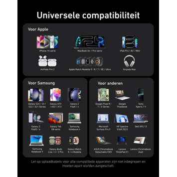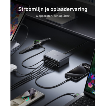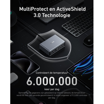 Met zes aansluitpunten heb je één centrale plek om telefoons, tablets, laptops of andere apparaten te laden. Dat scheelt losse adapters en kabels verspreid door huis of kantoor. De ingebouwde MultiProtect- en ActiveShield 3.0-technologie bewaakt continu de temperatuur en spanning tijdens het opladen, zodat je apparaten veilig blijven. In de verpakking zit naast het laadstation ook een netsnoer van 1,5 meter en een snelstartgids.