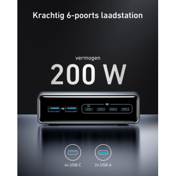 De Anker Prime oplader snelladen tot 200W (6 poorten) is een laadstation waarmee je meerdere apparaten tegelijk kunt opladen. Het totale vermogen is 200 watt, verdeeld over zes aansluitingen. Twee van de USB-C-poorten leveren afzonderlijk tot 100 watt, waardoor je zelfs apparaten met een hoog stroomverbruik, zoals laptops, snel van stroom voorziet. Zo laad je bijvoorbeeld twee 14-inch MacBook Pro’s in nog geen half uur op tot de helft van hun batterijcapaciteit.