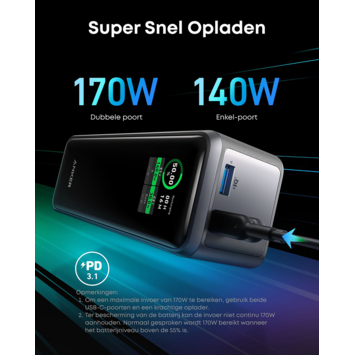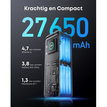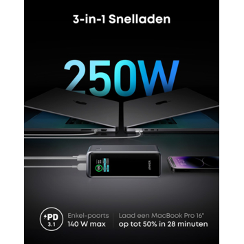 De Anker Prime powerbank snelladen 27.650 mAh (250W) is een compacte maar krachtige accu voor onderweg. Met twee USB-C-poorten en een USB-A-poort laad je meerdere apparaten tegelijk op, met een totaal vermogen tot 250 watt. Daarmee geef je een 16-inch MacBook Pro in nog geen half uur al 50% batterij. Dankzij een capaciteit van 27.650 mAh laad je een MacBook Air ruim één keer volledig op of een smartphone meerdere keren.