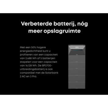 De Anker Solix BP2700 uitbreidingsbatterij vergroot de opslagcapaciteit van je Solarbank 2 of 3 systeem. Per module krijg je 2.688 Wh (2,7 kWh) extra opslag. Zo kan je meer van je eigen opgewekte zonne-energie opslaan en later zelf gebruiken.