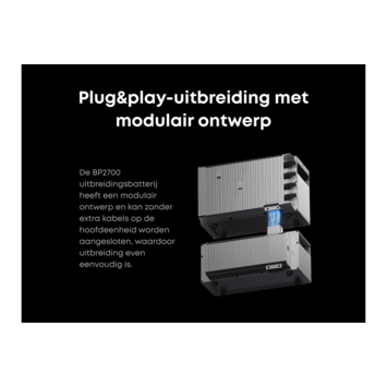 Met de BP2700 uitbreidingsbatterij voeg je meteen 2,7 kWh extra opslag toe aan het systeem. Zo verdubbel je direct de capaciteit van deze set. De module is eenvoudig stapelbaar zonder bijkomende bekabeling. Later kan je verder uitbreiden tot ongeveer 16 kWh, zodat het systeem mee evolueert met je energiebehoefte.