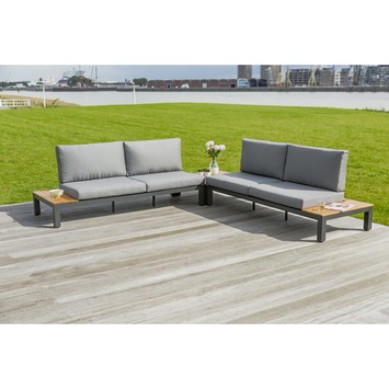 De loungeset Annecy is dé must have van deze zomer en exclusief verkrijgbaar bij GAMMA. Wat er zo leuk is aan deze loungeset voor 4? De set is gemaakt uit een originele combinatie van modern aluminium en authentiek hardhout dat je kan gebruiken als tafeltje voor je cocktail ... of mocktail. Verder is de set afgewerkt met zitkussens en rugkussens in de kleur antracietgrijs.