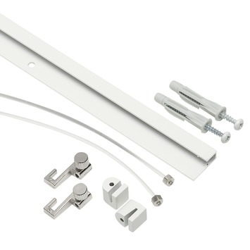 De Artiteq Basic Rail all-in-one complete set 2m wit het traditionele schilderij ophangsysteem om schilderijen aan de wand te hangen. De witte rail in J-vorm is 2 meter lang. U kunt de Artiteq Basic Rail snel en eenvoudig aan de wand monteren; zo heeft u in een mum van tijd uw schilderijen aan de wand hangen. Deze set bestaat uit Basic Rail van 2 meter, bevestigingsmateriaal, 2x cilinder haak met 2 x perlon ophangdraden en 2x haak 4kg.