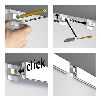 De Artiteq Click Rail is het meest eenvoudige en gebruiksvriendelijke schilderij ophangsysteem en zorgt ervoor dat je altijd flexibel bent in het ophangen van wanddecoratie zonder dat de wand beschadigd raakt. Bij montage dienen de clips op de muur bevestigd te worden en kan de rail op de clips worden geklikt. Dit zorgt voor een zeer nette afwerking. Vervolgens kunnen de transparante ophangdraden met haken via de zijkant in de rail op de gewenste plaats worden geschoven. Wanneer de juiste hoogte van de haken is bepaald kan de wanddecoratie aan de haken worden gehangen. Dit product wordt per complete set geleverd en bevat 3x Click Rail 200 cm, vier ophangkoorden met een lengte van 150 cm, vier haken die een draagkracht hebben van 4 kg en al het bevestigingsmateriaal. De kleur van deze rail is wit: RAL 9010. Naast het Artiteq Click Rail schilderij ophangsysteem compleet 6 meter wit crème, is de Click Rail ook in meerdere lengtes en (overschilderbare) kleuren beschikbaar bij GAMMA.