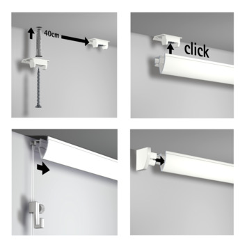 Makkelijk te bevestigen aan de houten lijst/rand van ons plafond. Valt mooi weg tegen de witte muur. Ook de transparante draden zijn nauwelijks zichtbaar. Ik ben erg blij met dit systeem!