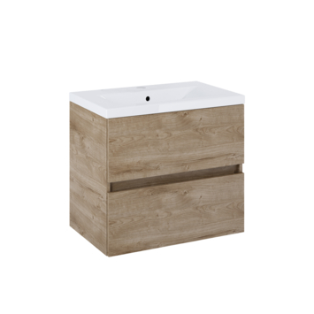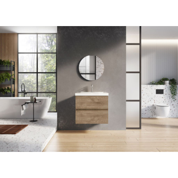 Dit badkamermeubel in eikenkleur met keramische wastafel combineert functionaliteit en een verzorgde uitstraling. De kast is compact maar biedt dankzij de twee diepe lades voldoende opbergruimte voor handdoeken, toiletgerief en verzorgingsproducten. De softclose-sluiting werkt stil en gecontroleerd, het greeploze front houdt alles strak. De geïntegreerde keramische wastafel vormt één geheel met de onderkast. De kraan wordt apart geplaatst, zodat je zelf een stijl kiest die bij de badkamer past. De warme eikenkleur sluit makkelijk aan bij andere meubels.