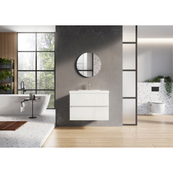 Deze Atlantic badkamermeubelset Heron van 80 cm in hoogglans wit combineert een keramische wastafel met een onderkast met twee softclose-lades. Het compacte meubel biedt voldoende opbergruimte voor handdoeken en toiletgerief en houdt alles overzichtelijk. De lades sluiten stil en gecontroleerd, het greeploze ontwerp houdt het front strak. De wastafel is geïntegreerd in het meubel, terwijl je de kraan apart kiest zodat die bij jouw badkamerstijl past. Dankzij het heldere wit en hoogglansdesign oogt de badkamer ruim en verzorgd.