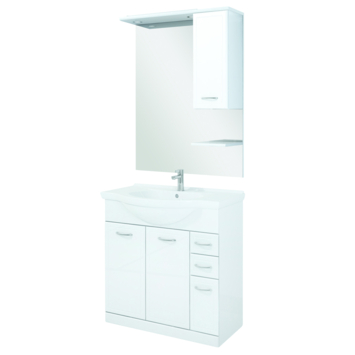 Wil je een badmeubelset met veel opbergmogelijkheden? Ga dan voor Atlantic badmeubelset Beatrice wit. Deze set bestaat in het totaal uit een spiegel, wastafel, 4 kastjes, 2 lades en een plank en biedt daarom genoeg ruimte voor je handdoeken, föhn en andere badproducten. Bovendien is de set voorzien van geïntegreerde lichtspots, zodat je er geen passende lamp bij hoeft te zoeken. De onderkast is 80cm breed en de wastafel is met 85,5cm net iets breder. Dankzij de witte hoogglans die over de spaanplaat heen zit, krijgt deze set een extra moderne uitstraling. Kortom: met deze badmeubelset is je badkamer in één keer af.
