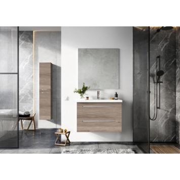 Een moderne badkamer kan niet zonder de strakke, maar elegante Sienna badkamermeubelset. De meubelen van deze set zijn gemaakt uit duurzaam mdf in de kleur wit, hout of betonlook. Deze houten set bestaat uit een hangende wasbak van 80 cm met 2 laden met softclose en een stijlvolle spiegel. Inclusief bevestigingsmateriaal; exclusief kraan, accessoires, sifon en afvoerplug. Wil je liever een industriële look, dan kan je het meubel voorzien van zwarte stalen frames (art. 137942). Een bijpassende kolomkast is apart verkrijgbaar.