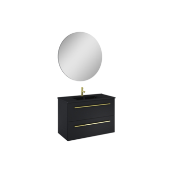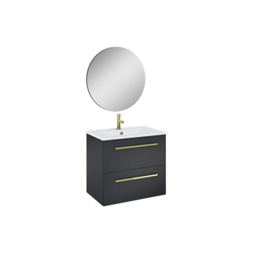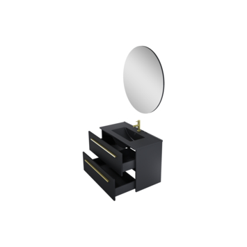 De Atlantic badmeubelset Stella met spiegel en zwarte wastafel 80cm Mat Zwart is een hangende set met een chique uitstraling. Dankzij het hangende design creëer je een ruimtelijke look in jouw badkamer. Het meubel is voorzien van 2 soft close laden en een mat zwarte keramische wastafel. Daarnaast is aan deze set een losse ronde spiegel toegevoegd. De set is voorzien van stijlvolle messing grepen, wat zorgt voor een chique en industrieel uiterlijk. De set wordt flatpacked geleverd en is eenvoudig te installeren met de meegeleverde bevestigingsmaterialen. Exclusief wastafelkraan.
