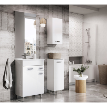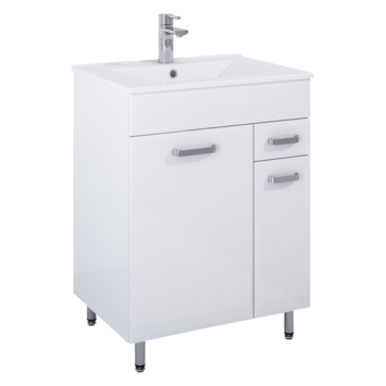 De Atlantic badmeubelset Emin van 60 cm wit wordt geleverd met wastafel Kyra, kraan en sifon. De onderkast heeft twee deurtjes en één lade met softclose, zodat alles soepel opent en zacht sluit.