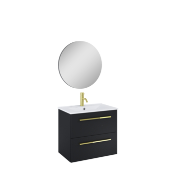 De Atlantic badmeubelset Stella met spiegel en witte wastafel 60cm Mat Zwart is een hangende set met een chique uitstraling. Dankzij het hangende design creëer je een ruimtelijke look in jouw badkamer. Het meubel is voorzien van 2 soft close laden en een witte keramische wastafel. Daarnaast is aan deze set een losse ronde spiegel toegevoegd. De set is voorzien van stijlvolle messing grepen, wat zorgt voor een chique en industrieel uiterlijk. De set wordt flatpacked geleverd en is eenvoudig te installeren met de meegeleverde bevestigingsmaterialen. Exclusief wastafelkraan.