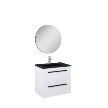 De Atlantic badmeubelset Stella met spiegel en zwarte wastafel 60cm mat wit is een hangende set met een chique uitstraling. Dankzij het hangende design creëer je een ruimtelijke look in jouw badkamer. Het meubel is voorzien van 2 soft close laden en een mat zwarte keramische wastafel. Daarnaast is aan deze set een losse ronde spiegel toegevoegd. De set is voorzien van stijlvolle mat zwarte grepen, wat zorgt voor een chique en industrieel uiterlijk. De set wordt flatpacked geleverd en is eenvoudig te installeren met de meegeleverde bevestigingsmaterialen. Exclusief wastafelkraan.
