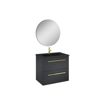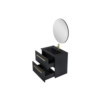 De Atlantic badmeubelset Stella met spiegel en zwarte wastafel 60cm mat zwart is een hangende set met een chique uitstraling. Dankzij het hangende design creëer je een ruimtelijke look in jouw badkamer. Het meubel is voorzien van 2 soft close laden en een mat zwarte keramische wastafel. Daarnaast is aan deze set een losse ronde spiegel toegevoegd. De set is voorzien van stijlvolle messing grepen, wat zorgt voor een chique en industrieel uiterlijk. De set wordt flatpacked geleverd en is eenvoudig te installeren met de meegeleverde bevestigingsmaterialen. Exclusief wastafelkraan.