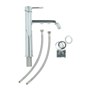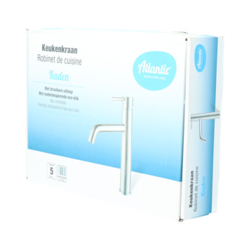 De Atlantic keukenkraan Kaden met hendel Chroom bestaat uit een keukenkraan met rechte, hoge uitloop, 2 flexibele aansluitslangen, bevestigingsmateriaal en montagehandleiding. De Kaden keukenkraan heeft een draaibare uitloop van 360° waarmee je eenvoudig plaats maakt bij je gootsteen. Ook de hoge uitloop op 16 cm geeft ruimte. Handig als je bijvoorbeeld een grote pan of emmer wil vullen. Met de eenhendelbediening draai je met 1 hand de kraan naar de gewenste temperatuur. Draaien doe je soepel en nauwkeurig dankzij de keramische schijven, die bovendien weinig onderhoud vergen. Je bespaart water door de ingebouwde eco-klik. Deze ingebouwde weerstand in de hendel zorgt ervoor dat je de kraan niet direct op de hoogste straalstand zet. Daarmee bespaar je dus op je waterverbruik. Wens je toch een hardere straal, dan zet je de hendel wat verder open. Kalk hecht zich moeilijk vast aan de anti-kalk perlator en je veegt het er makkelijk met de hand af. Deze rechte keukenkraan met hoge uitloop heeft een glanzend chromen afwerking en past met de tijdloze vormgeving in ieder keukeninterieur. Gebruik alleen water en een zachte doek om de kraan schoon te maken. Gebruik geen schurend, bijtend, azijnhoudend of agressief schoonmaakmiddel. Je hebt 5 jaar garantie op deze kraan.