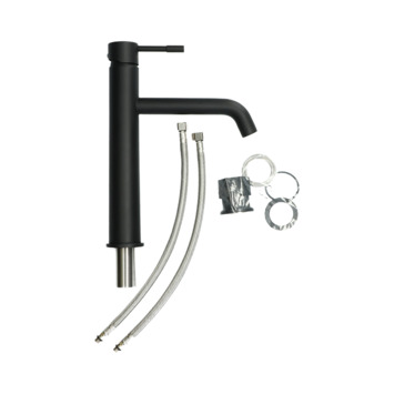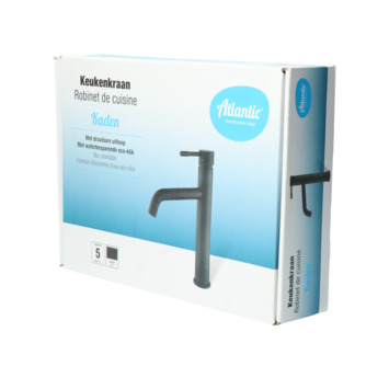 De Atlantic keukenkraan Kaden met hendel Zwart bestaat uit een keukenkraan met rechte hoge uitloop, 2 flexibele aansluitslangen, bevestigingsmateriaal en montagehandleiding. De Kaden keukenkraan heeft een draaibare uitloop van 360° waarmee je eenvoudig plaats maakt bij je gootsteen. Ook de hoge uitloop op 16 cm geeft ruimte. Handig als je bijvoorbeeld een grote pan of emmer wil vullen. Met de eenhendelbediening draai je met 1 hand de kraan naar de gewenste temperatuur. Draaien doe je soepel en nauwkeurig dankzij de keramische schijven, die bovendien weinig onderhoud vergen. Je bespaart water door de ingebouwde eco-klik. Deze ingebouwde weerstand in de hendel zorgt ervoor dat je de kraan niet direct op de hoogste straalstand zet. Daarmee bespaar je dus op je waterverbruik. Wens je toch een hardere straal, dan zet je de hendel wat verder open. Kalk hecht zich moeilijk vast aan de anti-kalk perlator en je veegt het er makkelijk met de hand af. Deze rechte keukenkraan met hoge uitloop heeft een mat zwarte afwerking en oogt daarmee robuust. Gebruik alleen water en een zachte doek om de kraan schoon te maken. Gebruik geen schurend, bijtend, azijnhoudend of agressief schoonmaakmiddel. Je hebt 5 jaar garantie op deze kraan.