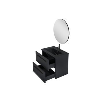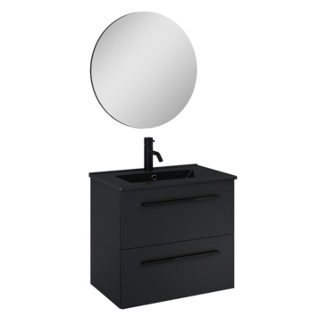 De Atlantic badmeubelset Stella met spiegel en zwarte wastafel 60cm mat zwart en zwarte grepen is een hangende set met een chique uitstraling. Dankzij het hangende design creëer je een ruimtelijke look in jouw badkamer. Het meubel is voorzien van 2 soft close laden en een mat zwarte keramische wastafel. Daarnaast is aan deze set een losse ronde spiegel toegevoegd. De set is voorzien van stijlvolle mat zwarte grepen, wat zorgt voor een chique en industrieel uiterlijk. De set wordt flatpacked geleverd en is eenvoudig te installeren met de meegeleverde bevestigingsmaterialen. Exclusief wastafelkraan.