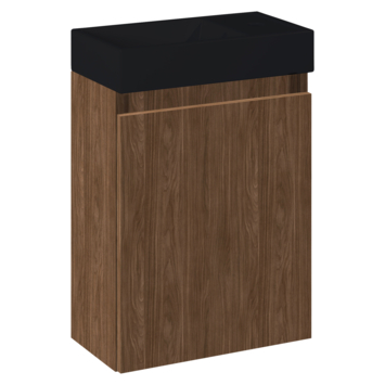De warme walnoottint zorgt voor een natuurlijke en elegante basis, terwijl de matzwarte wastafel een krachtig en stijlvol contrast toevoegt. Dankzij de softclose-deur sluit het meubel soepel en geruisloos, en de flexibele deurconstructie maakt het mogelijk om de deur zowel links als rechts te monteren, zodat het meubel perfect past bij de indeling van jouw ruimte.