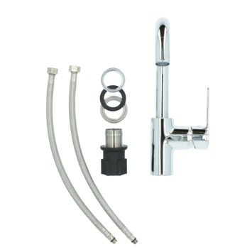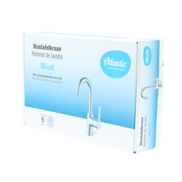 De Atlantic wastafelkraan Micah met hendel Chroom bestaat uit een verchroomde wastafelkraan van 27,1 cm hoog met 2 flexibele aansluitslangen, bevestigingsmateriaal en montagehandleiding. Met de eenhendelbediening draai je eenvoudig met 1 hand de kraan naar de gewenste temperatuur. Je bespaart water door de ingebouwde eco-klik. Een ingebouwde weerstand in de hendel zorgt ervoor dat je de kraan niet direct op de hoogste straalstand zet. Wens je toch een hardere straal, dan zet je de hendel gewoon verder open. Kalk hecht zich moeilijk vast aan de anti-kalk perlator en je veegt het er makkelijk met de hand af. Deze kraan heeft een mooie, glanzende verchroomde afwerking. Gebruik alleen water en een zachte doek om de kraan schoon te maken. Gebruik geen schurend, bijtend, azijnhoudend of agressief schoonmaakmiddel. Je hebt 5 jaar garantie op deze kraan.