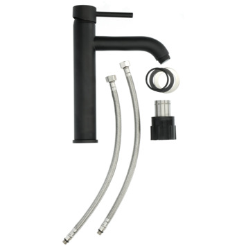 De Atlantic wastafelkraan Spencer met hendel Zwart bestaat uit een mat zwarte messing wastafelkraan van 25,5 cm hoog met 2 flexibele aansluitslangen, bevestigingsmateriaal en montagehandleiding. De Spencer wastafelkraan heeft een handige eenhendelbediening, waarmee je eenvoudig met 1 hand de kraan naar de gewenste temperatuur draait. Je bespaart water door de ingebouwde eco-klik. Deze ingebouwde weerstand in de hendel zorgt ervoor dat je de kraan niet direct op de hoogste straalstand zet. Wens je toch een hardere straal, dan zet je de hendel gewoon verder open. De Eco-start zorgt ervoor dat, als de hendel in het midden staat, alleen koud water door de kraan stroomt, in tegenstelling tot standaard mengkranen waarbij warm water gemengd wordt in de middelste stand. Zo bespaar je naast water door eco-klik dus ook (warmte)energie door eco-start. Kalk hecht zich moeilijk vast aan de anti-kalk perlator en je veegt het er makkelijk met de hand af. Met de mat zwarte afwerking heeft deze wastafelkraan van messing een robuuste uitstraling. Gebruik alleen water en een zachte doek om de kraan schoon te maken. Gebruik geen schurend, bijtend, azijnhoudend of agressief schoonmaakmiddel. Je hebt 5 jaar garantie op deze kraan.