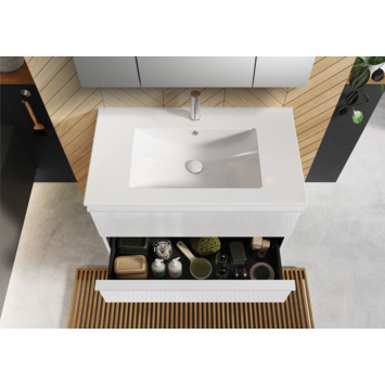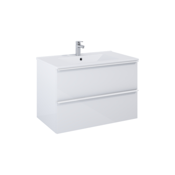 Het Aisa badmeubel van 80 cm wit biedt overzicht en praktische opbergruimte in de badkamer. Met twee ruime softclose-lades berg je handdoeken, verzorgingsproducten en andere spullen makkelijk op. De lange matwitte handgrepen maken openen en sluiten vlot, terwijl het hogere meubel extra ruimte geeft in de lades. De wastafel kies je zelf uit het Kyra- of Skappa-assortiment in zwart, wit of kasjmir, zodat je de set volledig aan je eigen stijl kunt aanpassen. Dankzij de afmetingen van 80 cm breed, 46 cm diep en 63 cm hoog past het meubel in zowel kleinere als grotere badkamers en blijft het functioneel. De matwitte afwerking en bijpassende grepen zorgen voor een rustig en modern geheel.