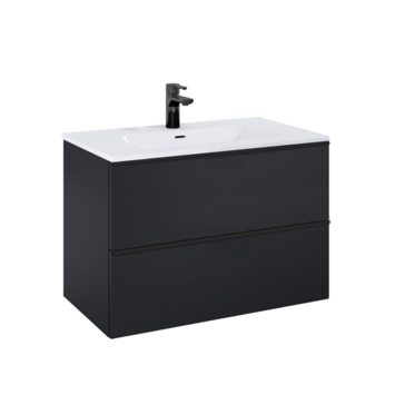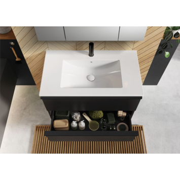 Het Atlantic badkamermeubel Aisa 80 cm in zwart geeft je badkamer meteen een verzorgde en moderne uitstraling. De twee softclose-lades sluiten stil en vlot, ideaal om handdoeken en verzorgingsproducten netjes weg te steken. Dankzij de hogere lades is er extra plaats voor grotere spullen of om alles overzichtelijk te houden. De grepen lopen over de volledige breedte van de lades en zijn ook zwart, zodat openen en sluiten moeiteloos gaat. Combineer het meubel met een wastafel uit de Kyra- of Skappa-lijn en kies de kleur die bij jou past: zwart, wit of kasjmir. Het geheel zorgt voor een strakke, tijdloze look. Maak je badkamer af met het Aisa meubel en geniet van een georganiseerde ruimte.