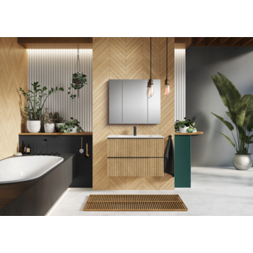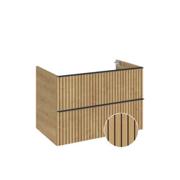 Het Atlantic badkamermeubel Orion 80 cm in geribbeld eik en zwart zorgt voor een strakke, moderne look in je badkamer en biedt veel opbergruimte. De twee softclose-lades met voelbare ribbelstructuur sluiten stil en vlot, ideaal om handdoeken en verzorgingsproducten netjes op te bergen. De grepen lopen over de volledige ladebreedte en zijn zwart, zodat openen en sluiten makkelijk gaat. Het contrast van eik en zwart maakt het meubel een echte eyecatcher. Combineer met een wastafel uit de Kyra- of Skappa-lijn en kies de kleur die bij jou past: zwart, wit of kasjmir. Zo maak je je badkamer overzichtelijk en stijlvol.